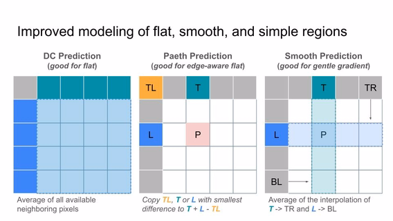- Paeth prediction — predicts a pixel by looking at the top, left, and top-left neighbors and picking the one closest to a computed value. Borrowed from PNG!