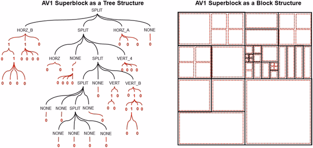 - Superblocks up to 128×128 pixels, with even more flexible recursive partitioning (10+ partition types, not just quad-tree like HEVC). So each of the block's partitions have types.